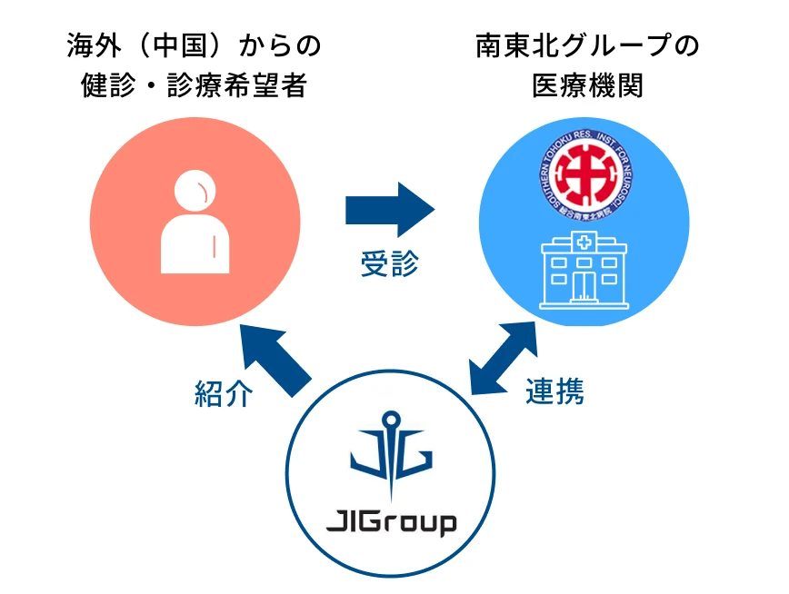 JIGは、国際医療部門の窓口として、海外(主に中国)からの健診や診察を希望する方を南東北グループの医療機関にご紹介する役割を担っています。